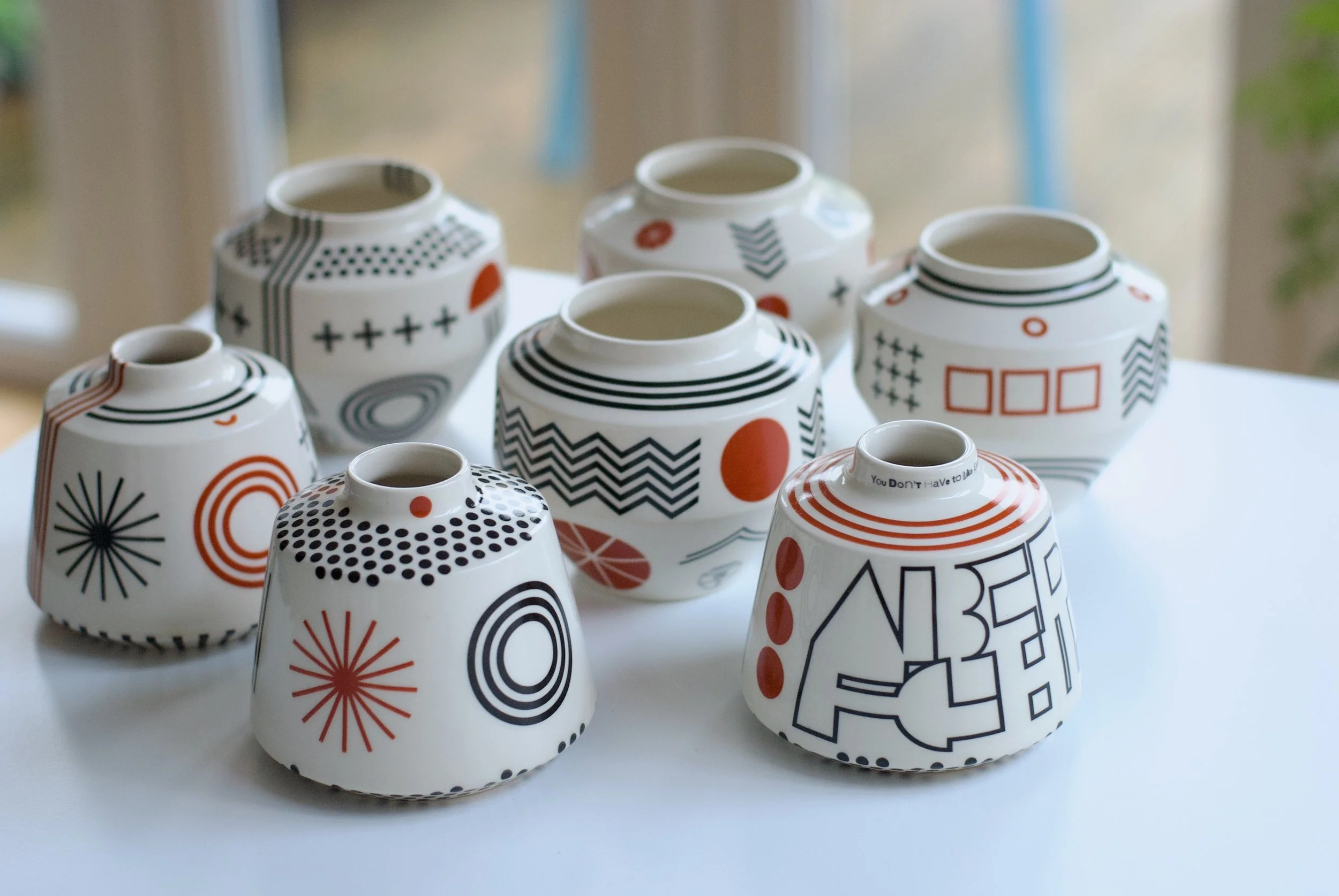 Keeley designed and made these slip-cast earthenware forms that are a vehicle for Dom’s unique graphic pattern application.